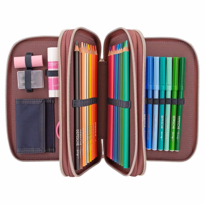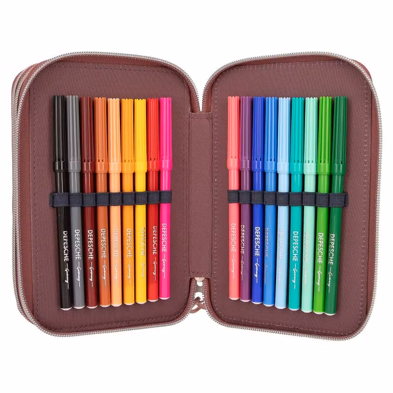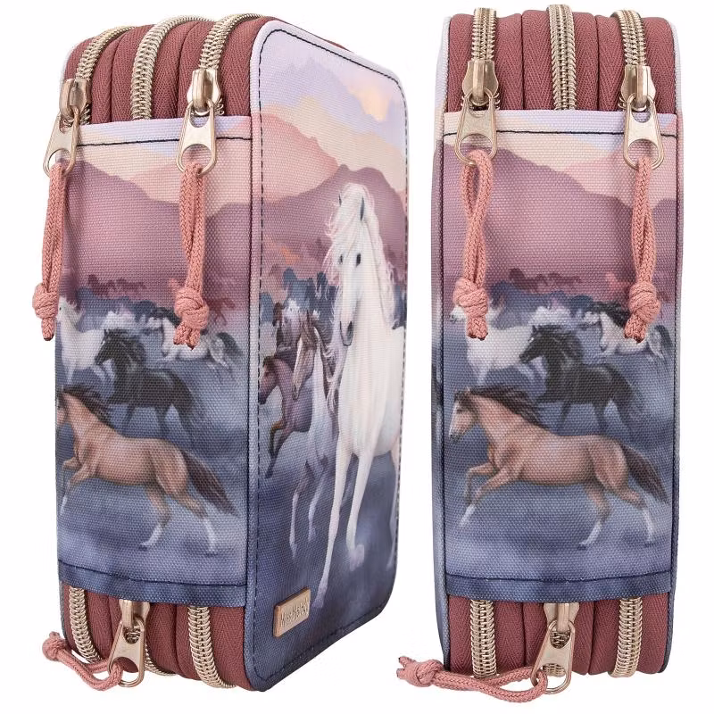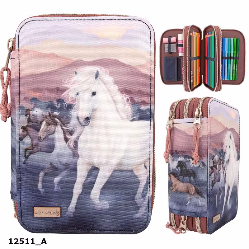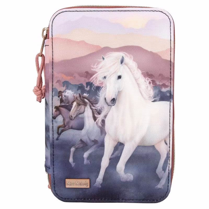 Fint pennfodral från Miss Melody NIGHT HORSES serien, med en springande flock hästar. Pennfodralet har tre stora fack fyllda med allt du behöver för att rita och skriva både i skolan och hemma, inklusive sax, lim, linjal, suddgummi, pennvässare, blyertspennor, 18 färgpennor, 18 tuschpennor och mycket mer.